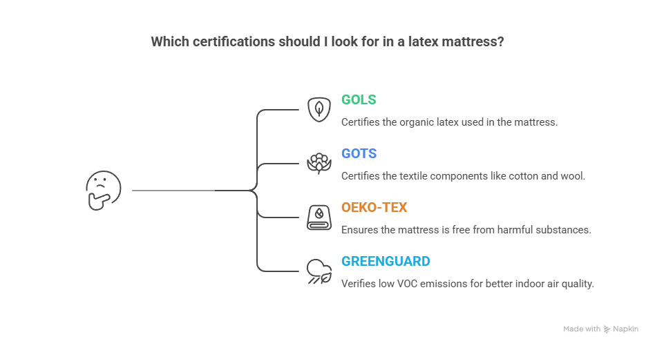 Seek latex mattresses with the Global Organic Latex Standard (GOLS), Global Organic Textile Standard (GOTS), OEKO-TEX, or GREENGUARD certifications. GOLS certifies the organic latex; the Global Organic Textile Standard (GOTS) certifies the textile components (cotton, wool). These verify the use of organic materials, low chemical emissions, and eco-friendly manufacturing practices. Certified latex mattresses are particularly important for chemical-sensitive sleepers and parents choosing a natural mattress for their family.