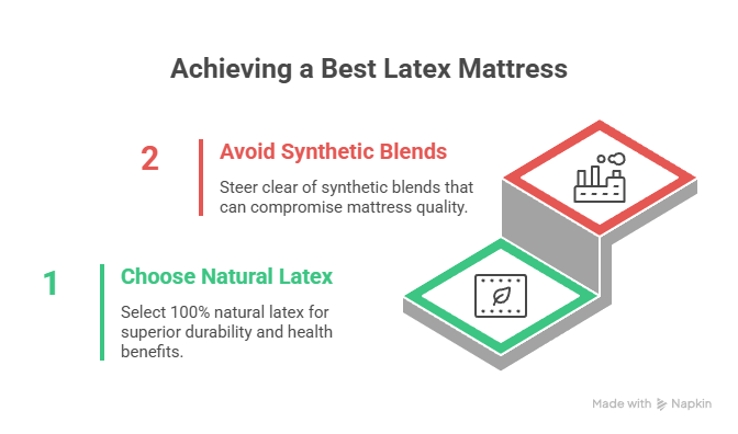Synthetic latex, manufactured from petroleum-based chemicals, costs less initially but degrades faster and may produce VOC odours during off-gassing. It typically lasts 6–10 years, compared to natural latex's 15–20-year lifespan. Synthetic latex and polyurethane foams are the two most common materials in cheap mattresses—worth keeping in mind when evaluating what you're actually buying. Blended latex combines natural and synthetic materials, offering moderate durability and cost, but synthetic components reduce overall longevity and environmental benefits.