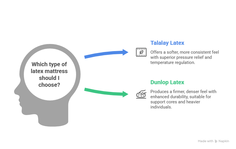 Both Talalay and Dunlop represent manufacturing processes for natural latex, each creating distinct characteristics.