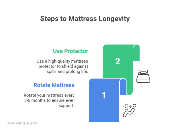 Rotating your mattress every 3–6 months helps keep the sleep surface evenly supported. A high-quality mattress protector can help protect your mattress from spills and prolong its life.