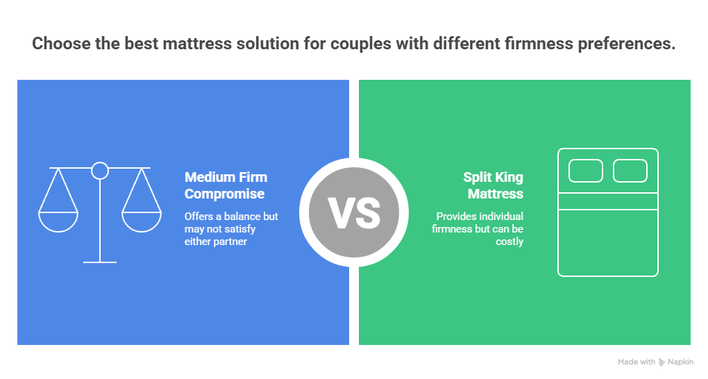 Most mattress guides offer one of two solutions for couples with different firmness preferences: a medium firm "compromise" or a split king mattress (two Twin XL mattresses placed side by side). Both have real limits.