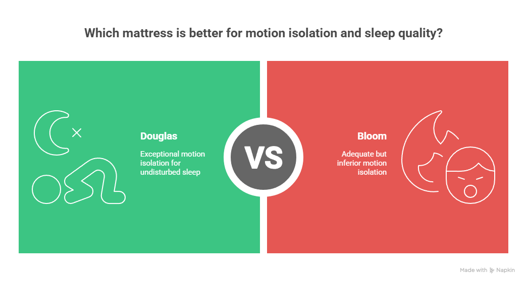 Douglas achieved the highest motion isolation score of any all foam mattresses tested. This exceptional performance means partner movements, even significant position changes, produce minimal motion transfer. For couples with different sleep schedules or a restless partner, this advantage can dramatically improve sleep quality and deliver a good night's sleep.