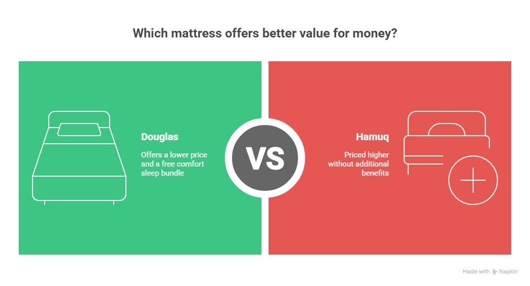 The value proposition becomes even more compelling with an included free comfort sleep bundle worth $350-400: two memory foam pillows, cotton sheets, a mattress protector, and pillow protectors. This effectively reduces the mattress cost to around $400-450 when accounting for bundled items. Meanwhile, the Hamuq prices at around $999 CAD to $1,099 CAD, which is 25% higher than Douglas.