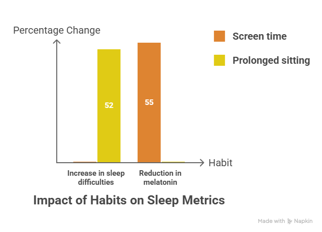 Screen time before bed is particularly damaging to sleep health. Electronic devices emit blue light that suppresses melatonin production, with research showing a 55% reduction in melatonin when screens are used in the hour before sleep times. The Lady Davis Institute and other Canadian research bodies have found that lower-income Canadians report 1.4 times higher screen time before bed, which may partly explain the socioeconomic sleep health gap.