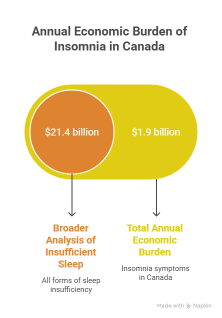 A 2023 study published in Sleep Health calculated the total annual economic burden of insomnia symptoms in Canada at $1.9 billion. The RAND Corporation's broader analysis of insufficient sleep puts the figure even higher, estimating Canada loses $21.4 billion or more annually when all forms of sleep insufficiency are included. These adverse health outcomes represent a staggering economic burden on the Canadian economy.