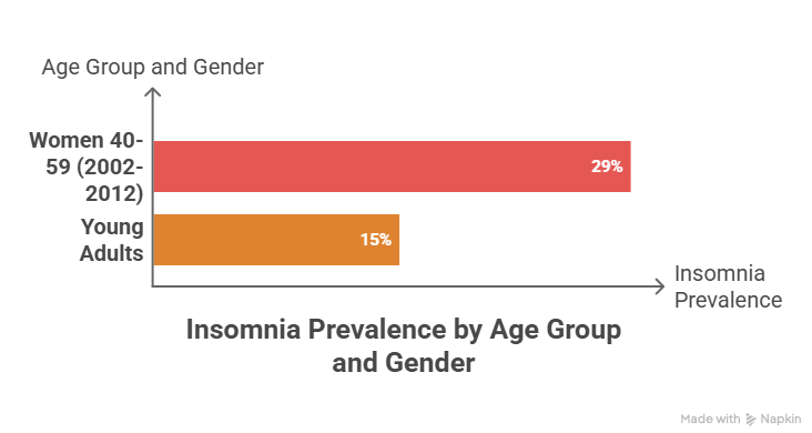 The gender gap is also widening over time. Between 2007 and 2021, women aged 18–64 saw a 1.24-fold increase in nighttime insomnia symptoms, while rates for men in the same age group stayed flat. Research published in applied physiology and sleep medicine journals confirms these self-reported patterns.