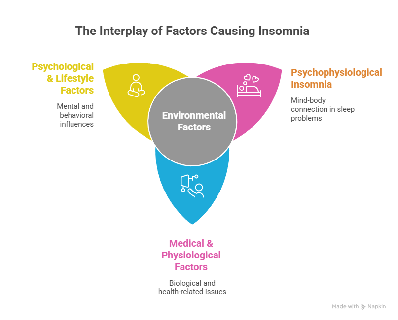 Insomnia rarely has a single cause. Research suggests it typically results from an overlap of psychological, physiological, behavioural, and environmental factors that disrupt sleep health.