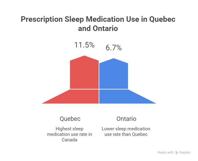 Among those using prescription medications, 80% self-reported side effects, including trouble focusing and morning grogginess. Quebec leads Canada in prescription sleep aid usage at 11.5%, compared to 6.7% in Ontario. Response options included both sedative and non-sedative medications, but research from Statistics Canada shows that medication alone rarely addresses the root causes of ongoing insomnia.