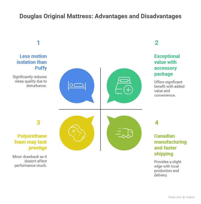 After comprehensive analysis, Douglas Original emerges as the best mattress choice for most Canadian sleepers, delivering excellent performance at exceptional value with unmatched customer protection. The C$799 price point, 365-night sleep trial, comprehensive accessory package, and solid construction make it difficult to justify Puffy's premium pricing for comparable benefits.