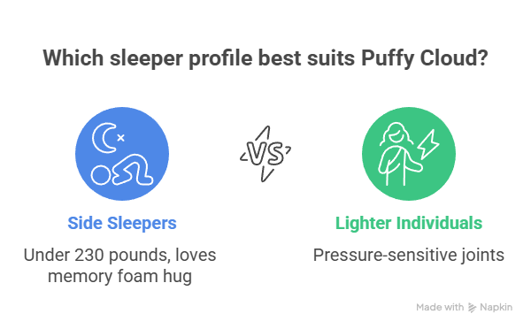 Puffy Cloud suits specific sleeper profiles best. If you're a side sleeper under 230 pounds who loves the classic memory foam "hug" sensation, Puffy delivers that experience with modern cooling improvements. The softer feel and deeper pressure relief work well for lighter individuals with pressure-sensitive joints.