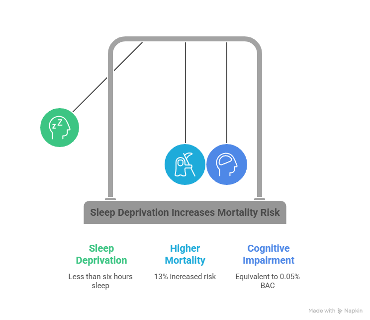The data puts it bluntly: sleeping fewer than six hours per night carries a 13% higher mortality risk than sleeping seven to nine hours. And when you stay awake for 18 consecutive hours, impairment matches a blood alcohol content of 0.05%. Sleep duration below this threshold is one of the most overlooked contributors to poor health outcomes.