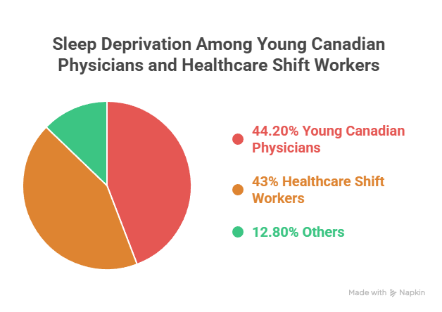 This is where the data gets alarming. 44.2% of young Canadian physicians report sleep deprivation, and 43% of healthcare shift workers' main sleep periods fall below seven hours. Canadian medical residents work up to 26-hour shifts with no national duty hour limits—Quebec is the only province to cap shifts at 16 hours. This represents one of the biggest threats to patient safety.