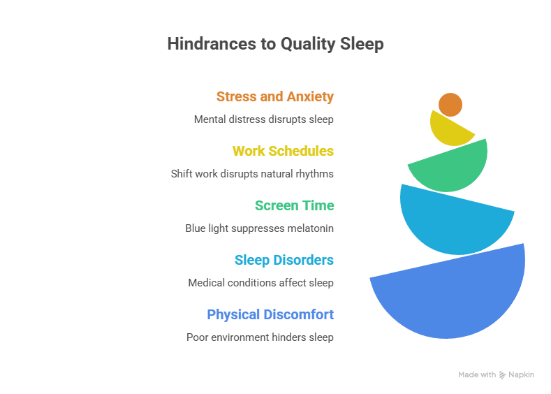 Work schedules and shift work are a major factor. Canada has no national standard for shift work duty hours outside Quebec, which abolished 24-hour hospital shifts in 2011. The rest of the country has no such limits, leaving millions of shift workers with fragmented sleep and chronic sleep deficiency. Irregular schedules driven by work demands are among the hardest sleep disorders to correct because they're structurally imposed.