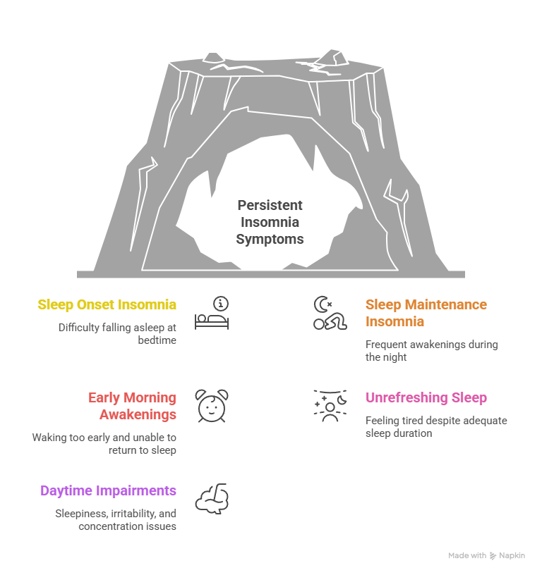 The most common symptoms include difficulty falling asleep (sleep onset insomnia), waking up frequently during the night and having trouble staying asleep (sleep maintenance insomnia), waking too early and being unable to fall back asleep, feeling unrefreshed despite spending enough hours of sleep in bed, and daytime sleepiness, irritability, or difficulty concentrating. These sleep disturbances can affect physical, mental, and overall health.
