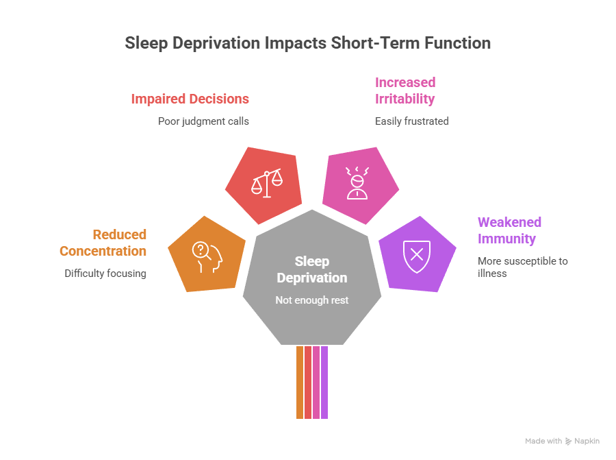 In the short term (one to three nights of not getting enough sleep), you'll experience reduced concentration and reaction time, impaired decision-making and memory, increased irritability and weakened emotional regulation, higher pain sensitivity, and weakened immune response. Even one night of disrupted rest can impair your ability to stay awake and function during everyday life.
