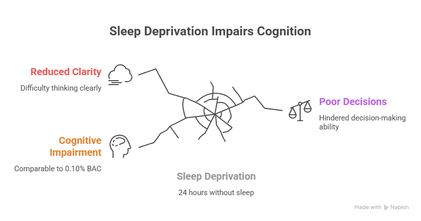 After 24 hours awake, cognitive performance degrades to a level equivalent to a blood alcohol concentration of 0.10%—above the legal driving limit in most jurisdictions (Brain-Apparatus Communication, 2025).