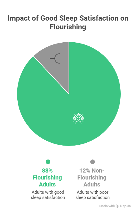 The NSF's 2025 Sleep in America Poll found that 88% of adults with good sleep satisfaction describe themselves as "flourishing"—reporting higher happiness, productivity, and quality of relationships. Among poor sleepers, fewer than 47% report the same level of well-being.