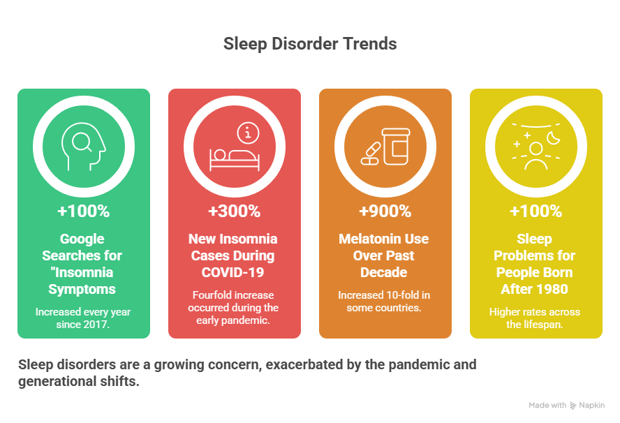 A 2025 machine-learning study from the University of Copenhagen, analyzing data from 2.2 million individuals, found that younger birth cohorts show earlier onset and higher rates of sleep problems—a trend driven by lifestyle shifts, chronic stress, and changing light environments.
