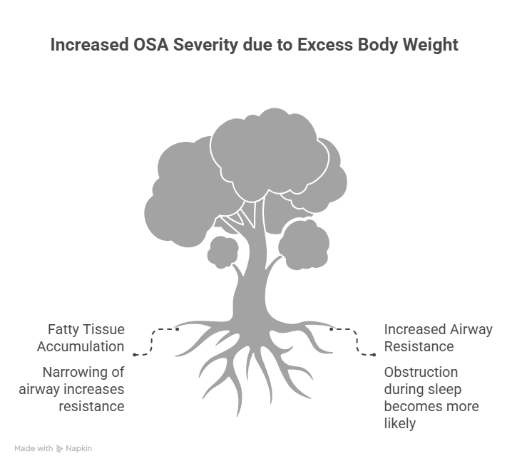 Increased body weight—particularly neck circumference and fat deposits around the upper airway—is the single largest modifiable risk factor for obstructive sleep apnea. Even modest weight loss can meaningfully reduce OSA severity.