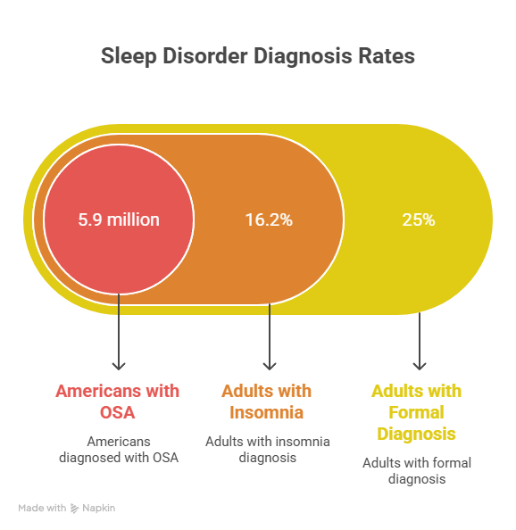 Despite 30%+ of adults experiencing insomnia symptoms, only 16.2% globally have received a formal insomnia disorder diagnosis (Sleep Medicine Reviews, 2025). The gap between symptom burden and clinical recognition is enormous.