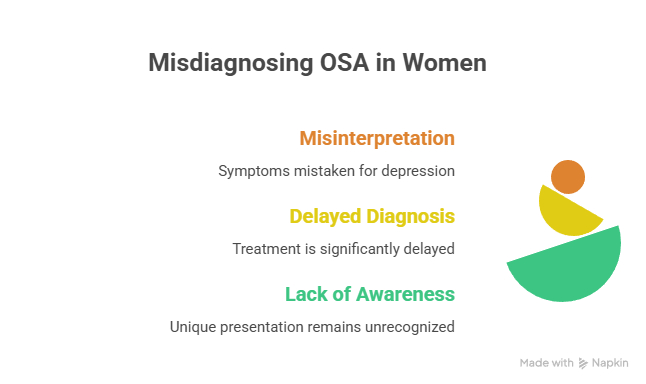 Women's OSA presentation—more commonly daytime sleepiness, mood changes, and insomnia rather than loud snoring—leads clinicians to misattribute symptoms to depression or stress. This pattern contributes directly to the 80–90% undiagnosis rate in women with severe OSA. Excessive daytime sleepiness is often dismissed as a lifestyle issue rather than investigated as a potential sign of obstructive sleep apnea.