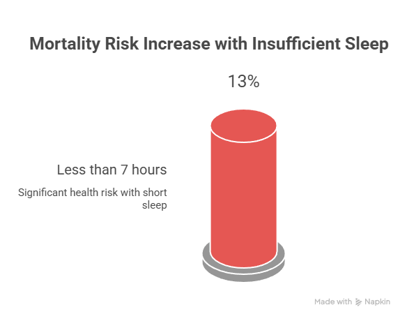 Research confirms that short sleep duration has been linked to cardiovascular disease, diabetes, stroke, obesity, hypertension, accidents, and malignant neoplasms—7 of the 15 leading causes of death in the United States (PMC, 2019). Heart disease alone accounts for a disproportionate share of sleep-related mortality.