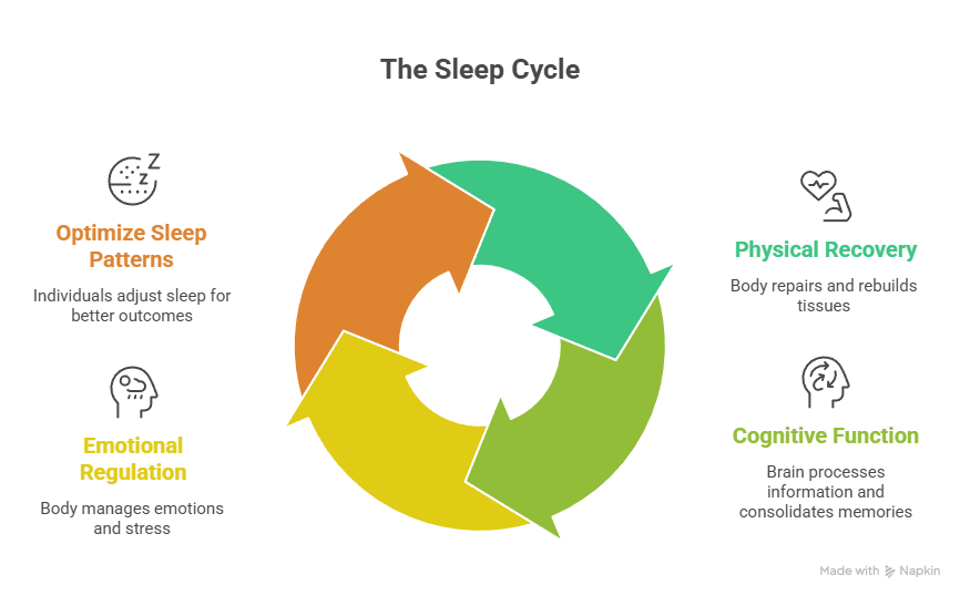 A complete sleep cycle lasts approximately 90 minutes and moves through several sleep stages: light NREM sleep, the deepest sleep stage (slow-wave sleep), and REM sleep. Each sleep cycle serves different restorative functions—from physical repair during the deepest sleep to memory consolidation in REM sleep. Disruptions to the sleep cycle, whether from sleep apnea, stress, or a poor sleep surface, prevent the body from completing these stages fully.