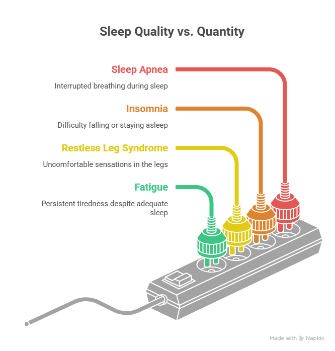 Many people with OSA or poor sleep quality spend adequate time in bed but don't get restorative sleep. Sleep duration alone doesn't capture sleep health. Research from the All of Us Program (Nature Medicine, 2024) confirmed that sleep regularity and stage composition independently predict chronic disease, independent of total sleep time.
