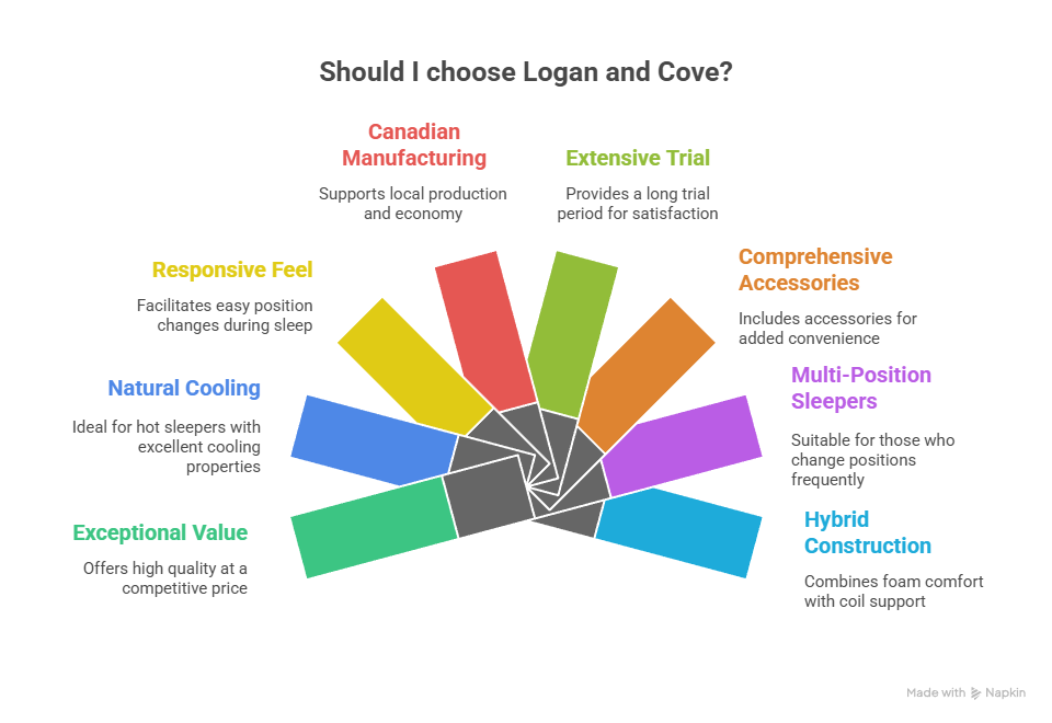 This Logan and Cove mattress review shows several advantages over other Canadian options, particularly in construction sophistication and consumer protection. While some brands focus on simple foam mattresses, Logan and Cove offer hybrid mattresses with coil support systems. The Logan and Cove also offer superior trial periods (365 vs 120 nights) and warranty coverage (15 vs 10 years) compared to many competitors. Both are Canadian-made, but Logan and Cove's medium-firm hybrid mattresses typically offer better cooling and responsiveness.